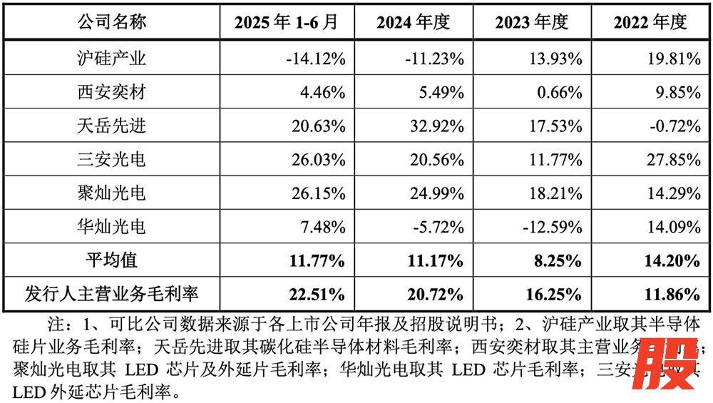 报告期内,其主营业务毛利率与天岳先进、三安光电、聚灿光电的毛利率水平比较接近,与沪硅产业和西安奕材毛利率存在较大差异,主要是沪硅产业和西安奕材主要产品为半导体硅片,生产过程、下游应用及行业地位与中图科技差异较大。