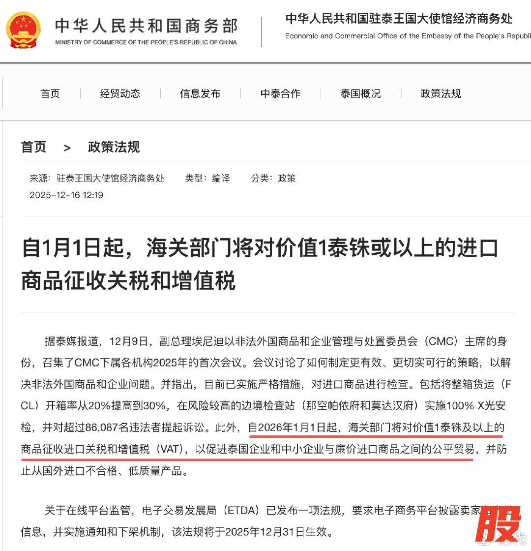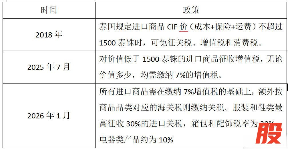 去年7月起,泰国政府对进口商品进行分阶段征收增值税,初期对价值低于1500泰铢(约合人民币330元)的进口商品征收7%的增值税。当时,该措施只是一项临时性措施,但后来被延长实行至2025年12月31日。这期间,进口关税仍可豁免。