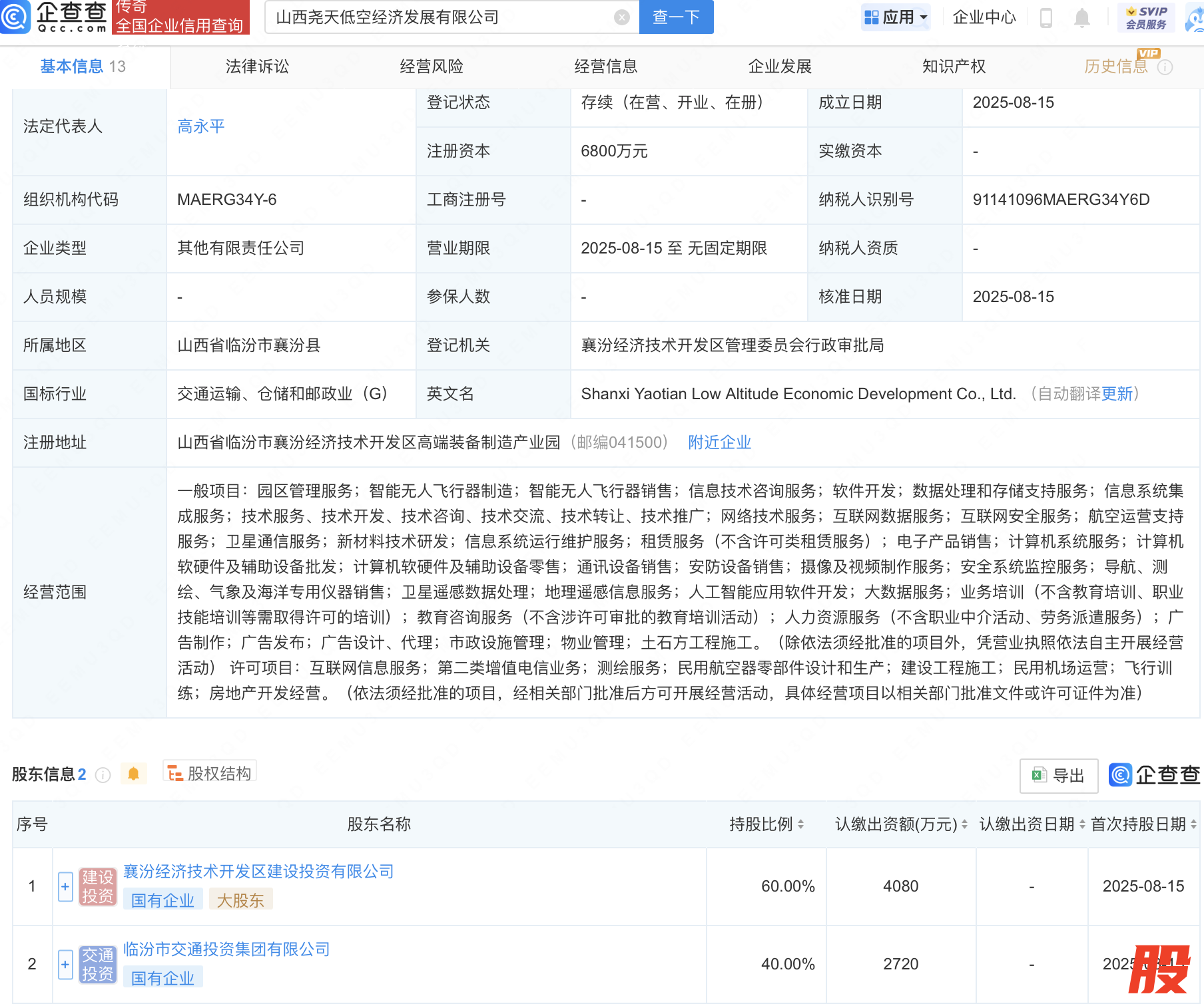 近日,山西尧天低空经济发展有限公司成立,注册资本6800万元,经营范围包含:智能无人飞行器制造;智能无人飞行器销售;地理遥感信息服务;人工智能应用软件开发等。企查查股权穿透显示,该公司由襄汾经济技术开发区建设投资有限公司等共同持股。
